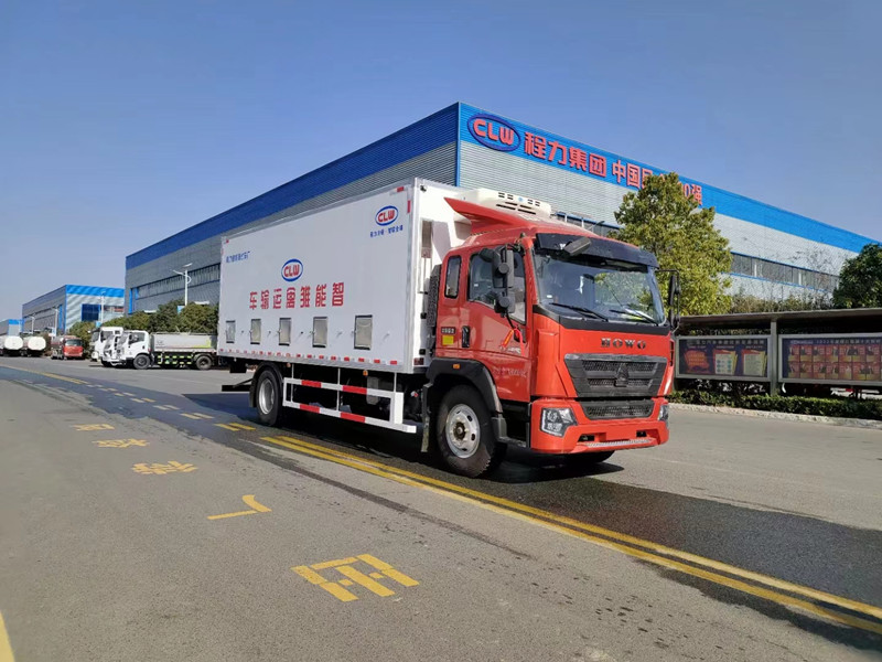 改装要求:改装要求:厢体采用内外玻璃钢板制作,中间8CM保温板,厢体两侧各开5个百叶窗,顶部3个天窗,顶部天窗两侧各装5个电子扇,前板中间靠下2个电子扇,前板左右两侧各开自然风换气口连接通风道,前板2个通风窗,内部加装货架,底板加热器通道,尾部4个电子扇。加装加热器,安装制冷机组。